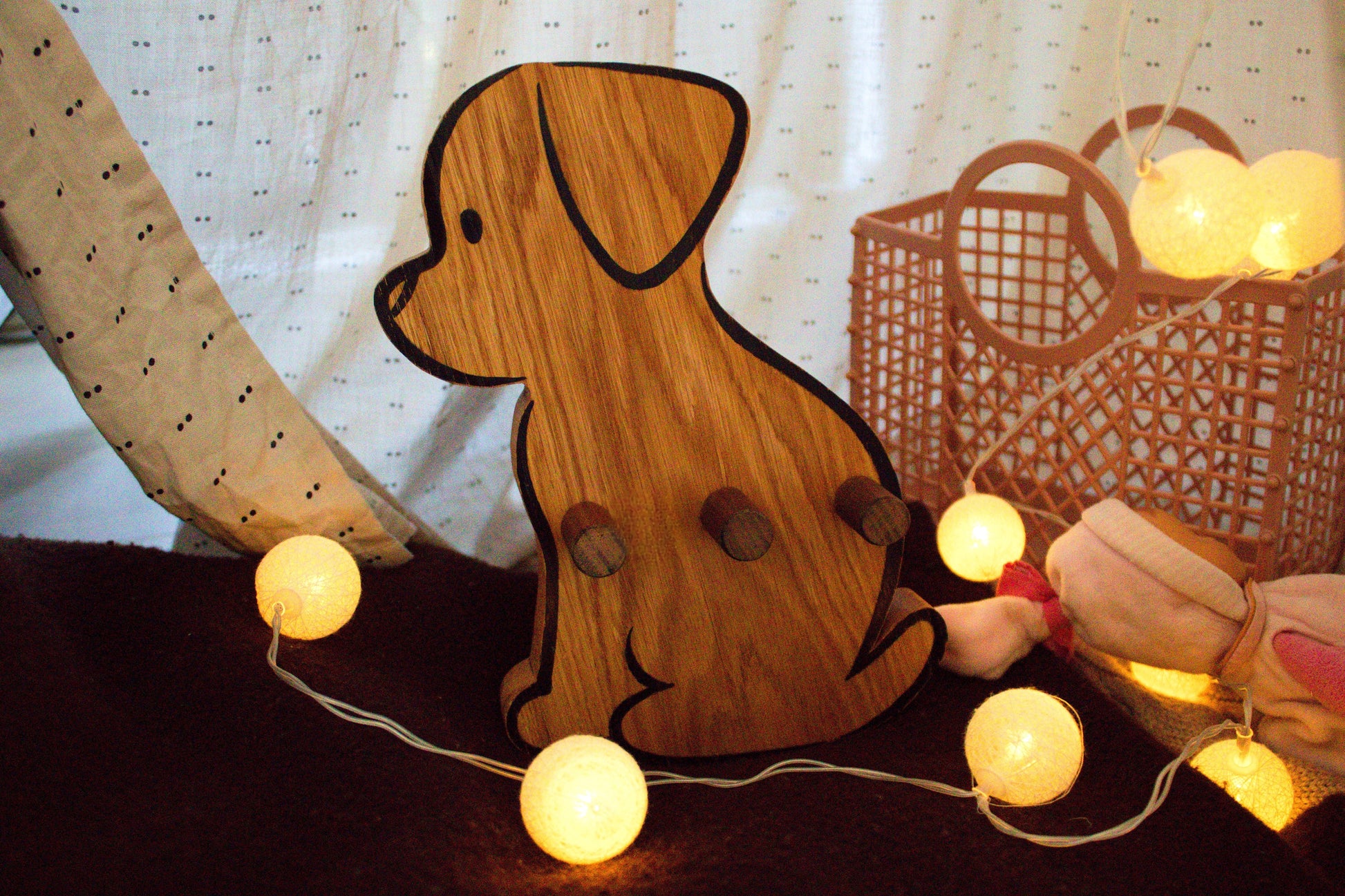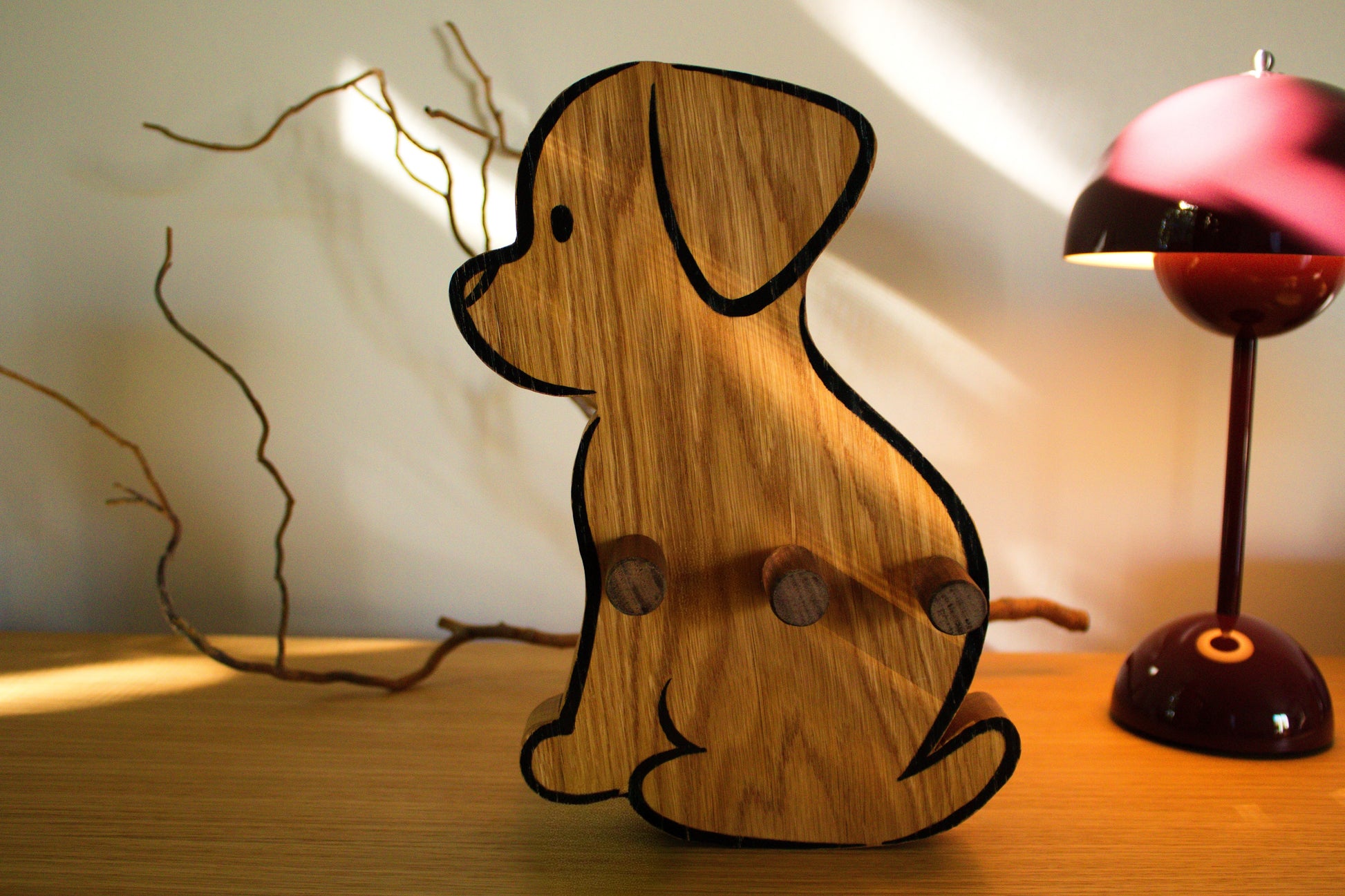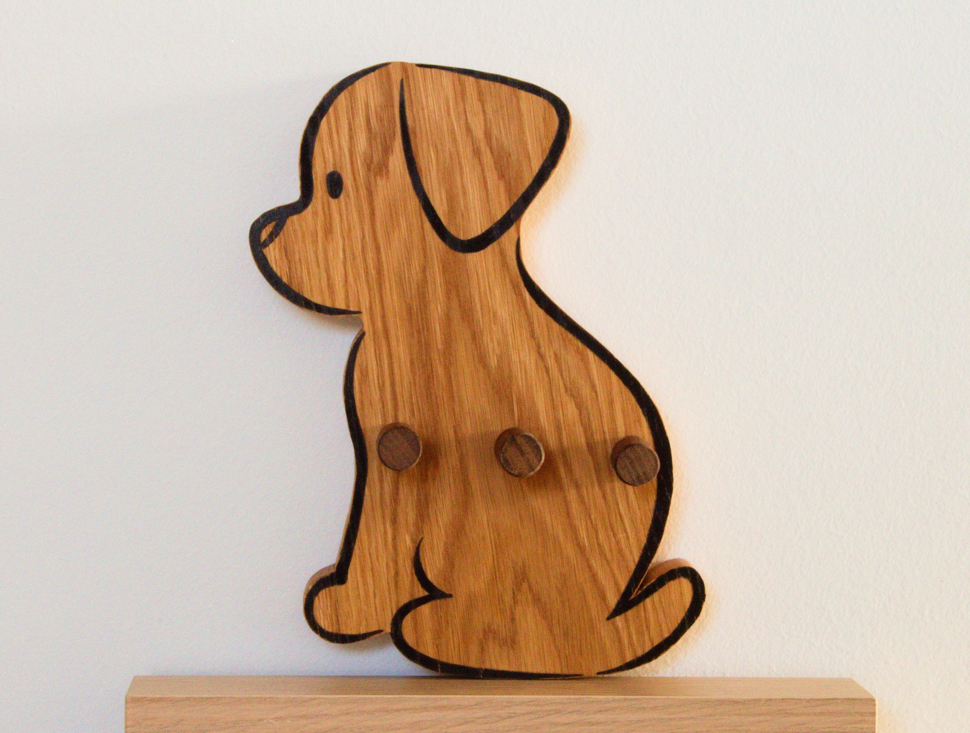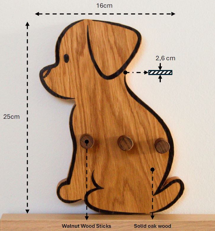 Add a touch of charm and functionality to your space with this dog-shaped wall hanger. Crafted from durable oak wood, Bruno features three sturdy hooks, perfect for organizing children coats, bags and other accessories while bringing playful warmth to any room.